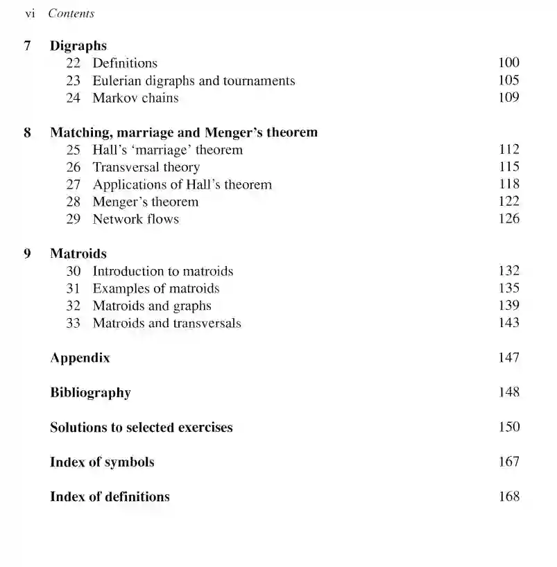 开篇章节提供了一个基础课程,包括树、算法、Euler和Hamilton图、平面图和着色等主题,特别提到了四色定理。接着,有两章关于有向图和横截理论,将这些领域与马尔可夫链和网络流等主题相关联。最后,有一章关于拟阵理论,用于巩固早些时候章节的一些材料。