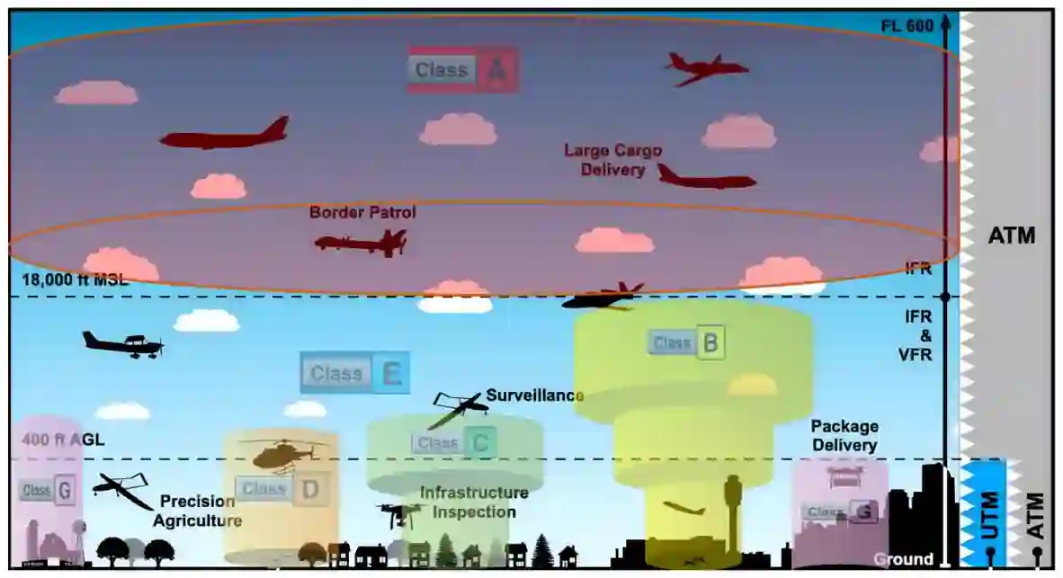 图 9 国家空域系统 (NAS) 运行与城市空中交通 (UTM) 运行的整合。传统飞行器和 AAM 飞行器共享 ATM 和 UTM 管理的空域(见图右侧)。
