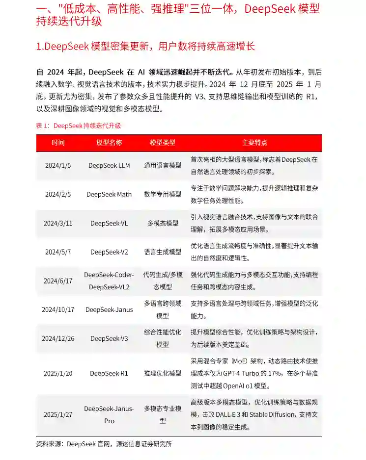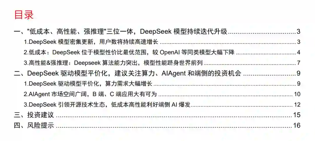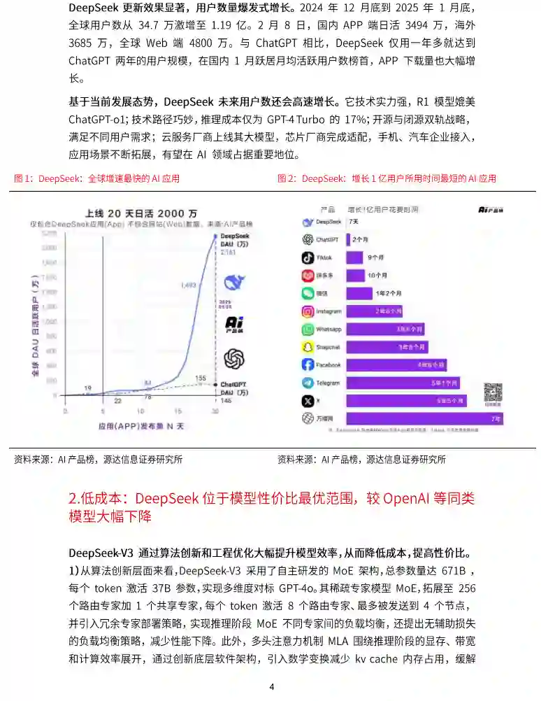 deepseek模型密集更新,用户数将持续高速增长 自2024年起,DeepSeek在AI领域迅速掘起并不断选代。2024年12月底至2025年1月底,更新尤为密集,发布了参数众多且性能提升的V3、支持思维链输出和模型训练的R1,以及深耕图像领域的视觉和多模态模型。2024年12月底到2025年1月底,全球用户数从34.7万激增至1.19亿。与ChatGPT相比,DeepSeek仅用一年多就达到ChatGPT两年的用户规模,在国内1月跃居月均活跃用户数榜首,APP下载量也大幅增长。 Deepseek具备低成本、高性能、强推理三大特点 DeepSeek-V3通过算法创新和工程优化大幅提升模型效率,从而降低成本,提高性价比。DeepSeekV3训练成本仅为557万美元,耗时不到两个月。DeepSeek通用及推理模型成本相较于OpenA等同类模型大幅下降。DeepSeek-R1在继承了V3的创新架构的基础上,在后训练阶段大规模使用了强化学习技术,自动选择有价值的数据进行标注和训练,减少数据标注量和计算资源浪费,并在仅有极少标注数据的情况下,极大提升了模型推理能力。在数学、代码、自然语言推理等任务上,DeepSeek在AIME2024测评中上获得79.8%的pass@1得分,略微超过OpenAl-01;在MATH-500上,获得了97.3%的得分,与OpenAl-01性能相当,并且显著优于其他模型 DeepSeek驱动模型平价化,建议关注算力、AI应用和端侧的投资机会 1)算力:随着更多用户对DeepSeek的使用,以及未来更多AI应用的不断涌现,对算力的需求呈现出几何级增长超势。AI技术的进步,虽然模型效率提高了,但不断增长的用户和应用数量,却对算力资源提出了更高要求,消耗也随之剧增。2)B端应用:AlAgent正在对传统SaaS应用进行全面重构。与传统知识库结构化管理模式相比,AlAgent的向量数据库具备强大的自主学习能力,能够自动理解文档内容,实现更加高效的知识管理,为企业的数字化转型提供了有力支持。C端应用:作为生成式AI的重要商业化应用,AlAgent在电商、教育、旅游、酒店以及客服等多个行业得到了广泛应用。3)端侧:AI正在内容、应用、硬件、生态上影响世界,AlAgent从“数字”走向“具身”随着市场发展,大模型更广泛地接入硬件产品,做好软硬件协同发展是未来竞争的关键。