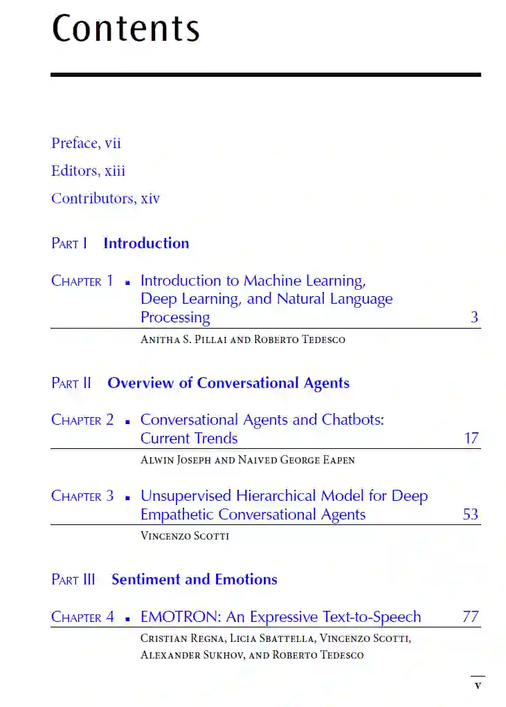 我们将章节组织成五个部分:I. 引言,II. 对话智能体概述,III. 情感和情绪,IV. 虚假新闻与讽刺,以及 V. 在医疗保健中的应用。在第一部分中,编辑介绍了机器学习(ML)、深度学习(DL)和自然语言处理(NLP)以及使用这些技术推进NLP应用的进步。第二部分提供了关于对话代理和聊天机器人的当前方法的概述。第2章专注于聊天机器人和对话代理(CAs)的应用,作者强调了各种AI技术如何帮助开发智能CAs,他们还比较了不同的最新NLP-based聊天机器人架构。第3章展示了一个为社交对话设计的开放域共情CA的架构,它分两步训练。代理学习对话的相关高级结构,利用无监督和有监督学习的混合,而在第二步中,代理通过有监督和增强学习进行精炼,学习通过选择最合适的高级响应方面来引发用户中的积极情感。第三部分关注情感和情绪检测的方法,以及用情绪增强的对话代理输出的生成。在第4章中,作者展示了EMOTRON,它是经过训练的情感语音的有条件生成,结合了光谱图回归损失来加强合成,和情感分类风格损失来引导条件化。第四部分介绍了应对虚假新闻和讽刺文本的方法。第5章强调了如何训练DL有效地区分讽刺内容和非讽刺。在第6章中,作者介绍了一个原型的开发,该原型旨在通过从新闻文章中检索可能提供支持或反驳声明的证据来帮助记者进行事实检查。最后,第五部分展示了在医疗领域的CA的一些实现。第7章关注于VocalHUM的算法组件的结构和开发,这是一个旨在实时增强患者低声细语的可懂度的智能系统,基于音频来最小化为实现足够的声音清晰度所必需的肌肉和呼吸努力,以及为正常强度讲话所需的物理移动。第8章识别了使用ML方法早期检测帕金森病所需的特征,第9章解释了CAs、NLP和ML如何在心理治疗中提供帮助。