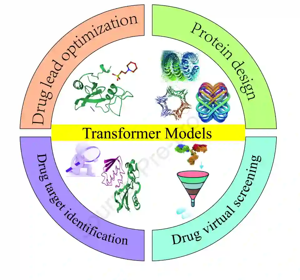 Transformer模型已成为药物发现领域中的关键工具,其独特的架构特征和在处理复杂数据场景中的卓越表现使其脱颖而出。通过利用Transformer架构固有的能力来理解序列数据中复杂的层次依赖性,这些模型在包括新药设计和药物靶点识别等各种任务中展现了显著的效果。预训练的Transformer模型的适应性使其成为推动药物发现、化学和生物学领域数据驱动进步的不可或缺的资产,提供了一个加速这些领域创新和发现的坚实框架。除了其技术实力外,基于Transformer的模型在药物发现、化学和生物学中的成功还延伸至其跨学科的潜力,能够无缝结合生物学、物理学、化学和药理学的见解,弥合不同学科之间的差距。这种综合方法不仅增强了研究工作的深度和广度,还促进了不同领域之间的协同合作和思想交流。在我们的综述中,我们阐明了Transformer在药物发现以及化学和生物学中的诸多应用,涵盖了从蛋白质设计与蛋白质工程、分子动力学、药物靶点识别、Transformer支持的虚拟筛选、药物先导优化、药物成瘾、小数据集挑战、化学和生物图像分析、化学语言理解到单细胞数据等方面。最后,我们通过探讨Transformer模型在药物发现及其他科学领域中的有前景的趋势为本次综述作结。