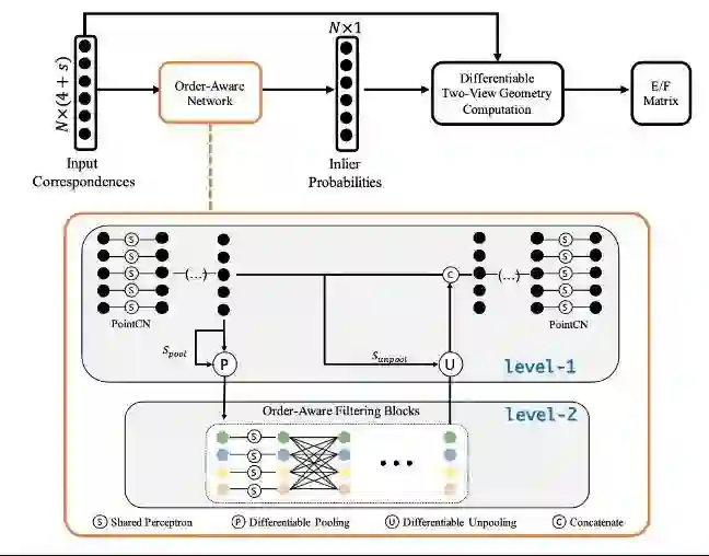 廖洪恩课题组提出了一种新的神经网络结构OANet(Order-Aware Network,图1)实现了对误匹配的高效识别和剔除。该网络以初始建立的匹配点对为输入,输出每对点对是正确匹配的概率。由于输入点对没有顺序关系,无法应用卷积神经网络,本研究从图卷积中的池化操作得到启发,以多层神经网络为基本结构,设计了差异化池化层(Differentiable Pooling layer)模块(图2左),通过训练得到一个分配矩阵(assignment matrix),将该矩阵和输入点对矩阵相乘,实现对输入点对的聚类(cluster)。文中证明,这样得到的聚类是输入不变的(permutation-equivariant),即无论输入点对是以什么顺序进入网络,得到的聚类顺序是不变的,这样通过网络学习到了输入点对的内在结构。为了使得网络能对每个输入点对都进行分类,又设计了差异化反池化层(Differentiable Unpooling Layer)模块(图2右),通过学习到一个反池化分配矩阵(unpooling assignment matrix),将聚类反投影成为与输入点对一一对应的输出结构。利用新的池化和反池化操作,可以构建层次化的图神经网络,从而极大地提升了基于多层神经网络的图神经网络的表达能力,并保持了O(N)的复杂度。网络最终为每个输入点对都被分配了一个概率,表示是否为正确匹配,以这个概率加权的八点法得到的两视图基本矩阵作为损失函数对网络进行训练。在应用阶段,剔除掉低概率的点对,就能实现对匹配的识别和过滤。