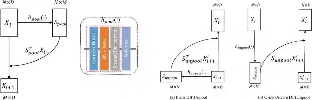 图2. 左:差异化池化层(Differentiable Pooling layer)模块;右:差异化反池化层(Differentiable Unpooling Layer)模块