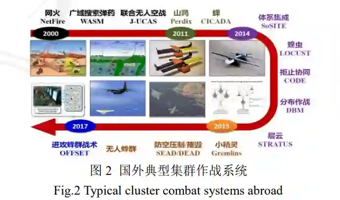 美军先后启动了“小精灵”、“灰山鹑”、“蝗 虫”等项目,验证了无人机蜂群多样化作战任务执 行能力[7-9]。美军曾在2014年启动了拒止环境中的协 同作战“CODE”项目,实现弱连通、强干扰条件下 无人集群的自主协同作业,美国国防高级研究计划 局(DARPA)通过一系列试验进行了试验验证。美 军的“小精灵”项目通过大型空中运输平台从空中 发射无人机集群实施侦察、干扰等任务,未被打击 的无人机具有再回收能力,可大限度节约成本。之 后,DARPA于2017年启动了进攻性蜂群使能战术 “OFFSET”项目,通过组建无人机蜂群作战系统来 支援城市环境下的地面作战部队,并针对该项目开 展了多次场地试验。国外典型集群作战系统如图2所示。