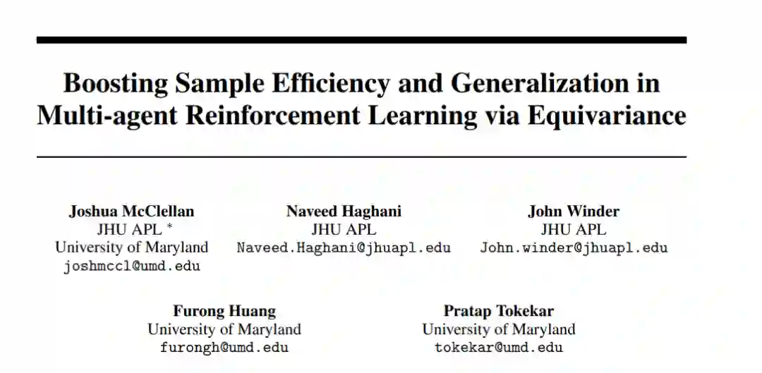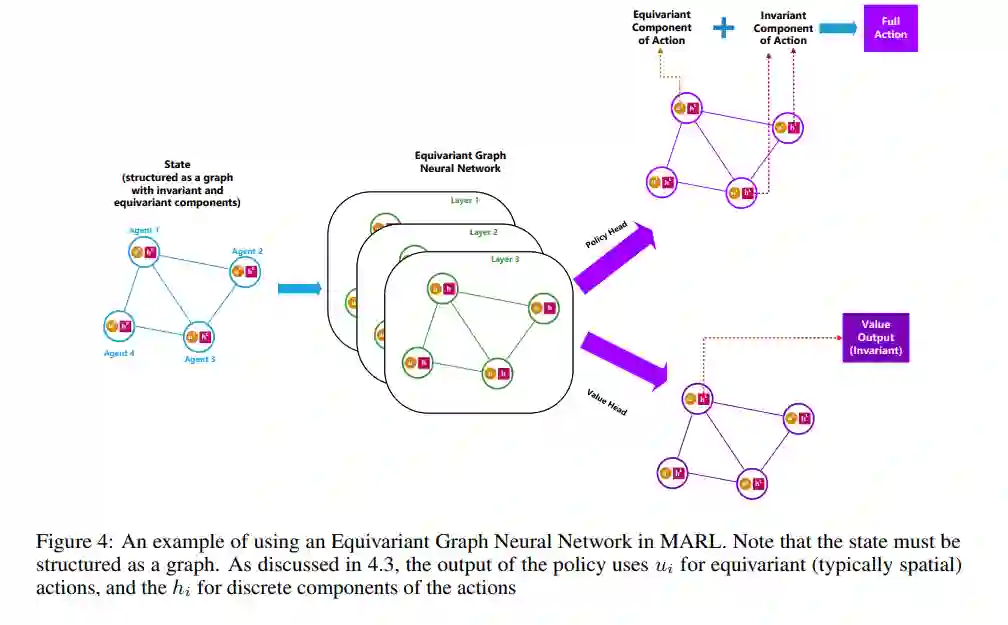 多智能体强化学习(Multi-Agent Reinforcement Learning, MARL)在样本效率和泛化能力方面存在挑战 [1]。这些挑战部分源于通常用于学习策略的神经网络缺乏结构或归纳偏置。在多智能体场景中,常见的一种结构是对称性。几何深度学习(Geometric Deep Learning)领域开发了等变图神经网络(Equivariant Graph Neural Networks, EGNN),它们对节点的旋转、平移和反射具有等变性(或对称性)。引入等变性已被证明可以提高学习效率并减少误差 [2]。本文中,我们展示了 EGNNs 提高了 MARL 的样本效率和泛化能力。然而,我们还发现,将 EGNNs 直接应用于 MARL 会导致早期探索表现不佳,这是由于 EGNN 结构中的偏置。为了解决这一问题,我们提出了探索增强型等变图神经网络(Exploration-enhanced Equivariant Graph Neural Networks, E2GN2)。我们将 E2GN2 与其他常用的函数逼近器进行了比较,使用了常见的 MARL 基准测试 MPE 和 SMACv2。结果表明,E2GN2 显著提高了样本效率,最终奖励收敛更高,并且在泛化测试中相较于标准 GNNs 提升了 2 倍至 5 倍的性能。我们的研究为在复杂多智能体系统中提供更可靠且有效的解决方案铺平了道路。