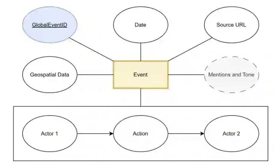 图 3.1. GDELT 事件数据库中一个数据元素的示意图。矩形代表中心数据元素,即事件。圆圈代表属性,属性 "GlobalEventID "用作唯一标识符。提及和音调 "属性是灰色的,因为它不属于本工作的范围。