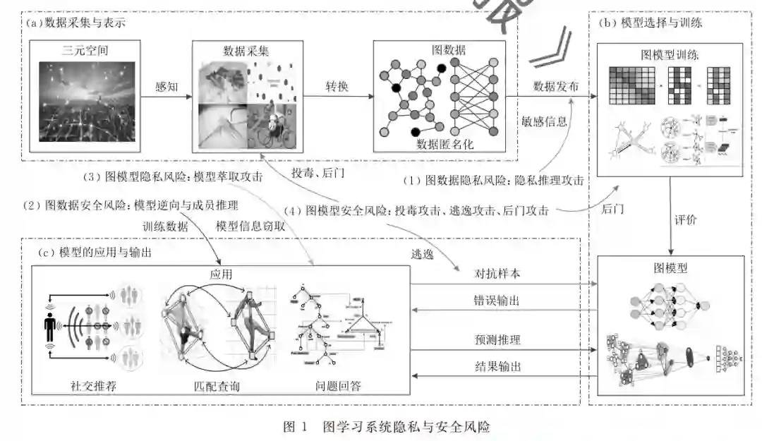 图数据安全关注图模型训练数据的窃取与泄露 风险.特别是对于提供开放服务的图学习系统,恶意 攻击者可能基于系统的输出结果窃取模型的训练数 据或者确定训练数据集中的成员信息,从而暴露敏 感信息、侵害服务提供商的合法权益.