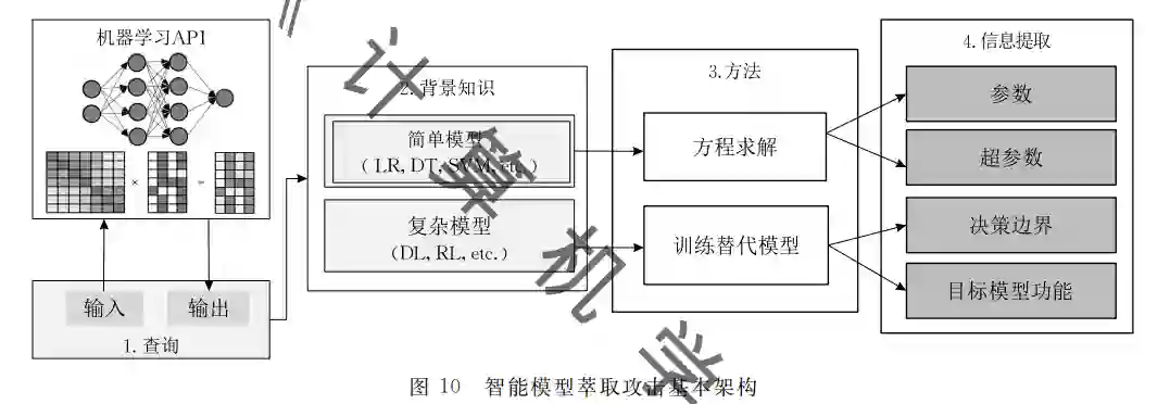 在智能服务系统中尽管智能服务接口是开放的, 但其后台学习模型是私有和保密的.然而,研究表明 攻击者可以通过开放的服务接口 API(获取模型的参数、架构、功 能等信息,从而造成模型机密信息的泄露.研究领域 将以上无 需 训 练 数 据 和 模 型 背 景 知 识,通 过 开 放 API获得模型架构、参数的过程定义为模型萃取攻 击.此攻击通过构建查询 输入并获得相应的模型输出形成输入、输出数据集. 这样的数据集能够反映目标模型的 内在特征.在理想情况下,只要构建了充分覆盖目标 模型输入空间的样本数据并获得相应的输出结果, 就可以复制目标模型. 根据目标模型的复杂度不同,模型萃取攻击可以 分为“简单模型精确提取”以及“复杂模型近似提取” 两大类.对于决策树、逻辑回归、支持向量机等简单模 型,其数学定义清晰,模型萃取攻击只需要获得充分的 输入、输出对,即可通过方程求解的形式推理模型参数 和超参取值,获得较准确的目标模型 .相对的,对 于深度学习、强化学习、集成学习等复杂模型,无法通 过明确的数学公式进行形式化定义,模型萃取攻击 需要通过输入、输出数据集间接刻画目标模型的内 在特征,然后基于此数据集训练替代模型以近似目标模型的功能 . 模型萃取攻击的基本架构如图10所示.