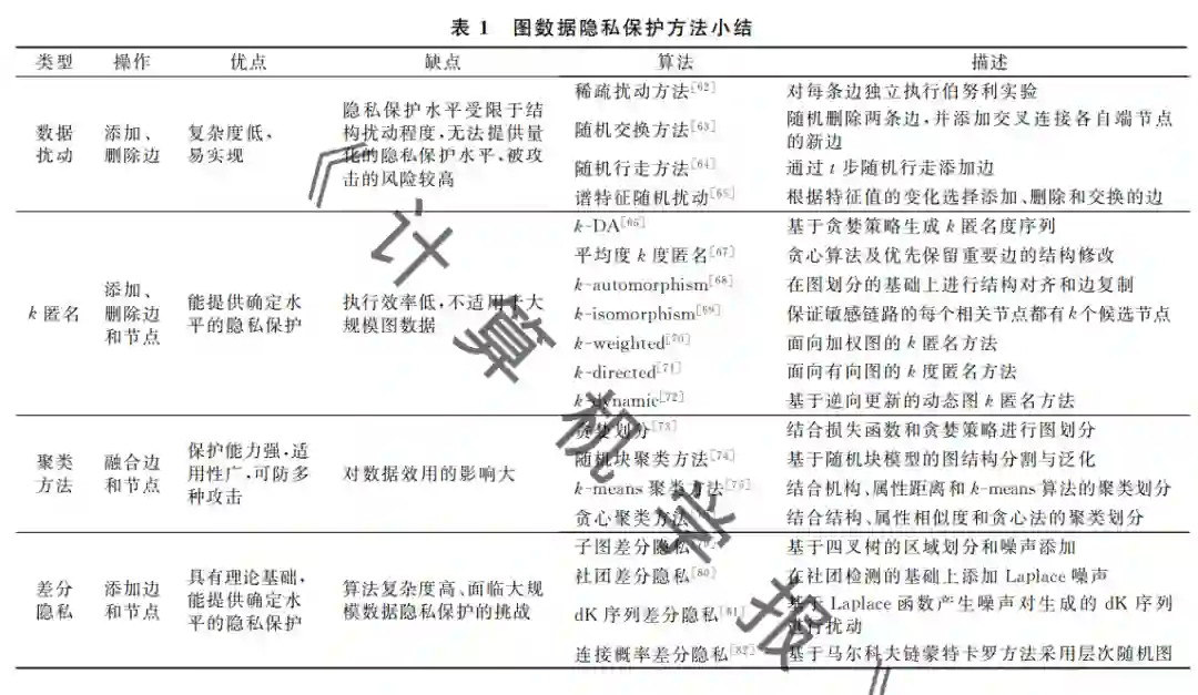 隐私保护的基本思想是在尽可能保持原始数据 不变的条件下对敏感信息进行隐藏,使得攻击者无 法通过背景知识对被隐藏的敏感信息进行重识别攻击.图数据隐私保护与节 点、属性和结构紧密相关,本节主要介绍代表性的图 数据隐私攻击行为和近年来提出的经典的图数据隐 私保护方法.表1是对图数据隐私保护方法的一个小结.数 据隐私保护问题近二十年来得到了研究领域较为充 分的探索,图数据隐私保护也得到了较多的关注,其 中数据扰动方法简单易实现,但发生隐私泄露的风 险较高.犽匿名、聚类方法以及差分隐私方法能够提 供更高水平的隐私保护,但聚类方法对数据效用的 影响较大,犽 匿名和差分隐私方法能够提供确定水 平的隐私保护,但它们复杂度较高.总体上,由于图 数据隐私保护场景的复杂性、背景知识的不可控性 以及要求保持数据效用等原因,仍然还有待提出效 率更高、适用性更好的图数据隐私保护方法.