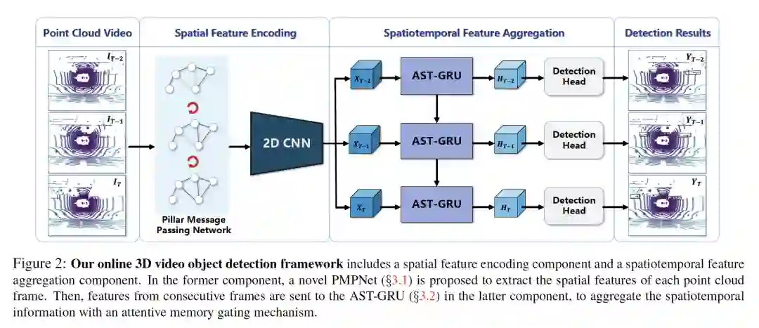 摘要:现有的基于LiDAR的3D目标检测算法通常侧重于单帧检测,而忽略了连续点云帧中的时空信息。本文提出了一种基于点云序列的端到端在线3D视频对象检测器。该模型包括空间特征编码部分和时空特征聚合部分。在前一个组件中,我们提出了一种新的柱状消息传递网络(Pillar Message Passing Network,PMPNet)来对每个离散点云帧进行编码。它通过迭代信息传递的方式自适应地从相邻节点收集柱节点的信息,有效地扩大了柱节点特征的感受野。在后一组件中,我们提出了一种注意力时空转换GRU(AST-GRU)来聚合时空信息,通过注意力记忆门控机制增强了传统的ConvGRU。AST-GRU包含一个空间Transformer Attention(STA)模块和一个时间Transformer Attention(TTA)模块,分别用于强调前景对象和对齐动态对象。实验结果表明,所提出的3D视频目标检测器在大规模的nuScenes基准测试中达到了最先进的性能。