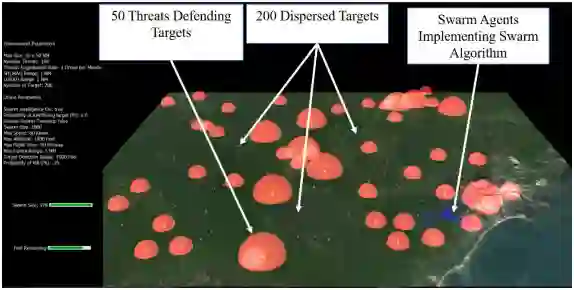 最后一个问题是,现有技术是否能够提供第2节所述的能力,以及这种能力是否会带来作战优势?为了回答这个问题,这项研究工作将开发一种蜂群智能算法,利用蜂群技术实现这一军事理论,在十年的时间框架内是可行的。本节将通过计算机模拟来分析这种蜂群智能算法提供所需能力的能力(图3)。蜂群中的每个代理将实施蜂群智能算法来攻击这个敌方系统,目标是在120分钟内尽可能多地找到并摧毁200个分散的目标。为了分析结果,这项研究工作将使用模拟技术来比较没有蜂群的1000个智能体的质量和有蜂群的800个智能体的质量。如果其中任何一个能够找到、固定并摧毁超过50%的指定目标,那么根据陆军理论,本分析将认为敌方系统不具备作战能力或作战无效。使用这种方法,本文将比较每一个,以确定蜂群武器是否能够在未来十年内提供这些能力。