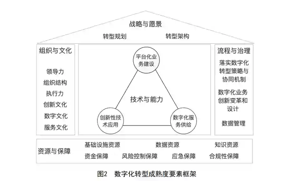 数字化转型成熟度要素框架见图2。基于数字化转型业务参考模型,识别出数字化转型的关键要素 包括战略与愿景、组织与文化、流程与治理、技术与能力,以及资源与保障。本文件在识别出的关键要 素基础上提出各要素相关的成熟度分级要求,构建数字化转型成熟度等级模型,指导数字化转型工作。