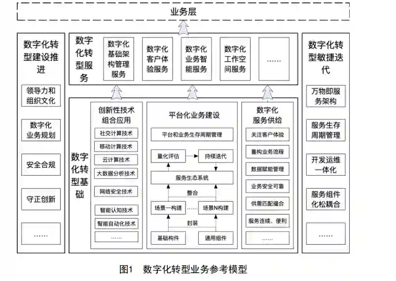 数字化转型的成熟度管理,需要明确相关的业务活动域,以数字化转型业务参考模型(见图1)的 基础。数字化转型工作的业务活动域包括技术上构架数字化转型基础和数字化转型服务,业务上实施数 字化转型的建设推进管理和数字化转型的敏捷迭代,同时考虑转型工作所支撑的业务特性。
