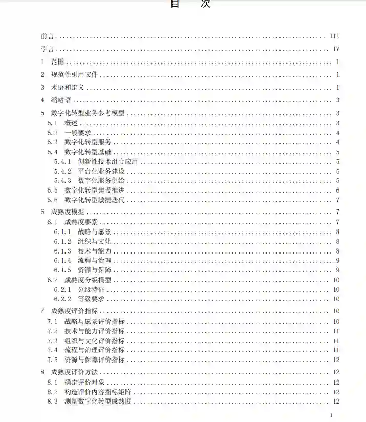 ——成熟度模型与评估。目的在于确立依托于信息技术服务的数字化转型工作需要遵循的总体原 则和相关业务框架,并为数字化转型的推进工作确立可评价的成熟度等级,并为相关评价工作建立指标 体系和程序。 ——就绪度评估。目的在于为开展数字化转型的主体提供现状距离转型目标的就绪情况评估标准, 帮助主体明确其转型工作的重点与次序,为数字化转型工作的有效推进提供基础分析。 ——成效评价。目的在于为开展数字化转型的主体提供转型成效评价方法,便于主体完成转型工作 的效/费分析。 ——中小企业实施指引。目的在于面向中小企业提供相适应的转型工作实施指引,帮助中小企业更 有效地推进数字化转型。 ——跨灾种监测预警技术要求。目的在于面向紧急度较高的突发事件应对领域的监测预警方向提 供数字化转型相关的技术要求,支撑数字化突发事件应对能力的建立。《信息技术服务 数字化转型 成熟度模型与评估》是一个新标准,其目的是提供关于数字化转型的 术语,定义,业务参考模型,成熟度模型相关要素、要求和指标,及其评价实践指导的公共框架。