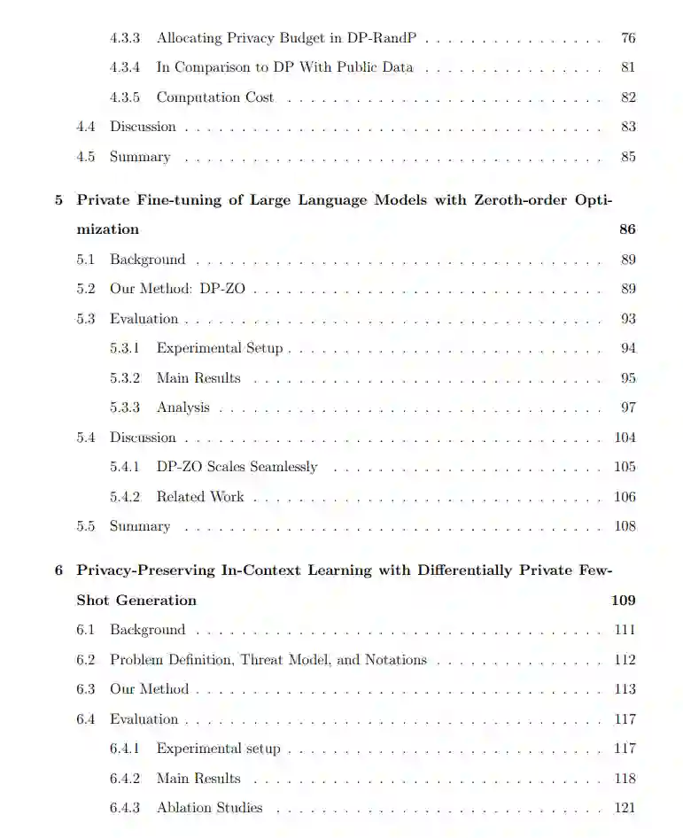 第四,针对差分隐私的合成数据生成,我们研究了仅通过 API 访问大型语言模型而不进行微调的情况下私密生成数据的方法。我们提出的方法能够为大型语言模型的上下文学习 (in-context learning) 提供隐私保护,并支持无限查询。