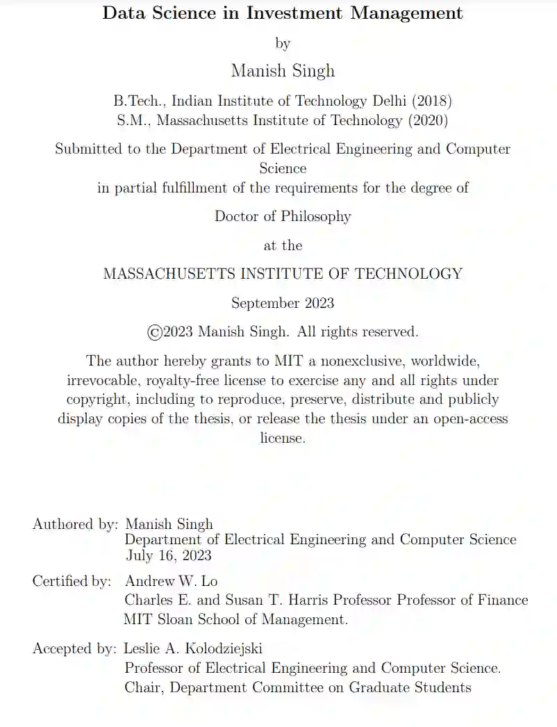 在这篇名为《数据科学在投资管理中的应用》的论文中,我们旨在探索数据科学和人工智能在投资管理各个维度的应用,为行业提供创新的解决方案和洞见。这篇论文由几个部分组成,每个部分都针对投资管理的不同方面,利用数据科学技术提供有价值的洞见。 在第一部分中,针对行业和加密货币,我们开发了一个动态分类系统,根据来自广泛的结构化和非结构化数据特征的量化相似性,对股票进行分组。有了大数据的可用性,我们能够使用人工智能(AI)方法从各种数据源提取有关公司的相关信息,并根据市场看法了解它们未来的相似性。在第二部分中,我们研究为融合能源和生物制药投资创建资本和投资组合管理的方法。通过利用诸如投资组合方法之类的计算技术,我们为高风险、高回报的冒险项目(如融合研究和生物制药投资)提供了新颖的见解。我们还量化了临床试验结果对公司股价的影响,这可以帮助生物制药投资者进行风险管理。鉴于对ESG投资的日益关注,我们研究了ESG投资的超额回报。我们还开发了一种衡量生物制药公司产品对患者生活影响的方法,这可以吸引ESG基金投资于生物制药公司。论文的下一部分调查了金融风险处理的实时心理生理分析,使用数据驱动的方法,深入了解投资决策背景下的人类行为。在接下来的部分中,我们专注于使用可解释的机器学习来解决消费者信贷风险的重要问题。在最后一部分中,我们总结了人工智能和数据科学在金融领域的未来。