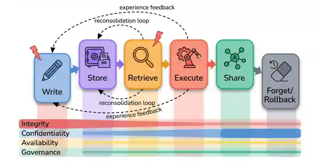 本文旨在填补这一细分领域的研究空白。借鉴认知神经科学与记忆哲学,我们将智能体记忆刻画为具塑性(Malleable)、可重写性及社会传播性的实体。据此,我们构建了一个涵盖六个阶段——写入(Write)、存储(Store)、检索(Retrieve)、执行(Execute)、共享(Share)以及遗忘/回滚(Forget/Rollback)——的记忆生命周期分析框架,并将其与完整性、机密性、可用性和治理性四大安全目标进行交叉分析。利用该框架,我们对关于记忆投毒、提取、检索破坏、控制流劫持、跨智能体传播、回滚及治理的现有文献进行了系统梳理,并探讨了代表性架构如何决定哪些生命周期阶段具备显式可治理性。 本综述具有三大核心发现: 1. 研究分布失衡:现有文献高度集中于写入时与检索时的完整性攻击;而关于机密性、可用性、存储/遗忘阶段以及良性持久化失效(如压缩、漂移或幻觉导致的非对抗性记忆错误)的研究依然稀缺。 1. 架构治理缺失:在所有受调研的记忆架构中,均未实现本文提出的全部九种治理原语;其中,**写入门控验证(Write-gate validation)与删除后验证(Post-deletion verification)**是现有系统的共同盲点。 1. 防御工具链亟待加强:将 LLM 自身作为记忆安全工具(如自动化红队测试、防御侧验证、反事实压力测试)的次要研究路径虽尚处起步阶段,但至关重要。若防御机制未经适应性 LLM 驱动的红队压力测试,则无法达到成熟安全领域所要求的严谨性。