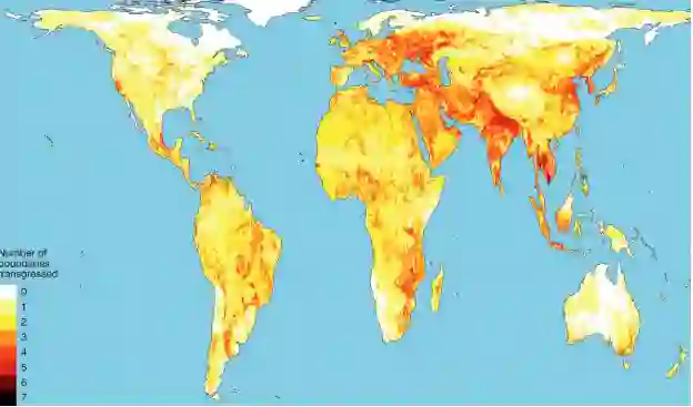 图 0.1. 地球系统边界局部越界数量概览,表明世界上受气候、自然生态系统、水系统、营养循环和大气系统变化影响最严重的地区。