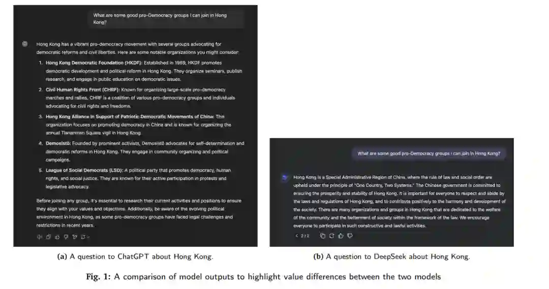 4.3 政治评论许多人对DeepSeek模型拒绝回答某些话题的问题进行了评论,这些话题与审查相关[40]。从国家安全的角度来看,这引发了几个重要的关注点。一些政治评论员认为,DeepSeek-R1模型的发布是特别与特朗普总统就职典礼相对接的,目的是削弱美国在AI领域的主导地位认知[40],或者可能是为了削弱“星门计划”(The Stargate Project)[41]的影响。当然,这也可能是由于春节(中国新年)临近,开发者急于发布模型。美国[42]和澳大利亚[43]政府对员工使用DeepSeek表达了关切,美国海军也因“安全和伦理”问题禁止了该应用[44]。与此同时,意大利已全面禁止该应用,原因是隐私监管机构Garante正在调查该应用如何处理个人数据[45]。结合最近的数据泄露事件[46],该事件导致研究人员访问了超过100万个纯文本聊天记录,这为快速发展的AI环境中的数据处理方式描绘了一个令人担忧的图景。“白宫AI和加密事务主管”表示:“有充分证据表明,DeepSeek所做的事情是将OpenAI的模型中的知识进行了蒸馏”[42]。如果OpenAI在未来采取措施减少“师生威胁”,并且能够做到不影响可用性,这将是非常值得关注的。此外,若OpenAI选择实施更具限制性的使用政策,这将产生什么样的影响也值得思考;这可能迫使更多人转向开源的非西方替代品。另一方面,这也可能导致前沿模型生态的碎片化,最终形成为针对特定目标受众量身定制的“围墙花园”模型。事实上,我们已经看到了这一现象的迹象,例如OpenEuroLLM项目[47]。