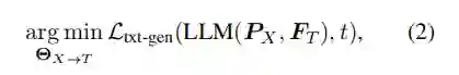 针对不同的模态,存在多种预训练的编码器选项MEX,其中X可以是图像、视频、音频、3D等。对于图像,有多种可选的编码器,如NFNet-F6、ViT、CLIP ViT、Eva-CLIP ViT、BEiT-3、OpenCLIP、Grounding-DINOT、Swin-T、DINOv2、SAM-HQ、MAE、RAM++、Swin-B、InternViT和VCoder。对于视频,可以将其均匀采样为5帧,并对其进行与图像相同的预处理。音频模态通常使用CFormer、HuBERT、BEATs、Whisper和CLAP进行编码。三维点云模态通常使用ULIP-2和PointBERT作为后端进行编码。此外,为了处理众多异构模态编码器,一些MM-LLMs,特别是任意到任意类型的编码器使用ImageBind,这是一种涵盖图像/视频、文本、音频、热图、惯性测量单元和深度等六种模态的统一编码器。2.2 输入投影器输入投影器ΘX→T将其他模态FX的编码特征与文本特征空间T对齐,生成提示PX,与文本特征FT一同输入LLM主干。目标是最小化X-条件下的文本生成损失Ltxt-gen。