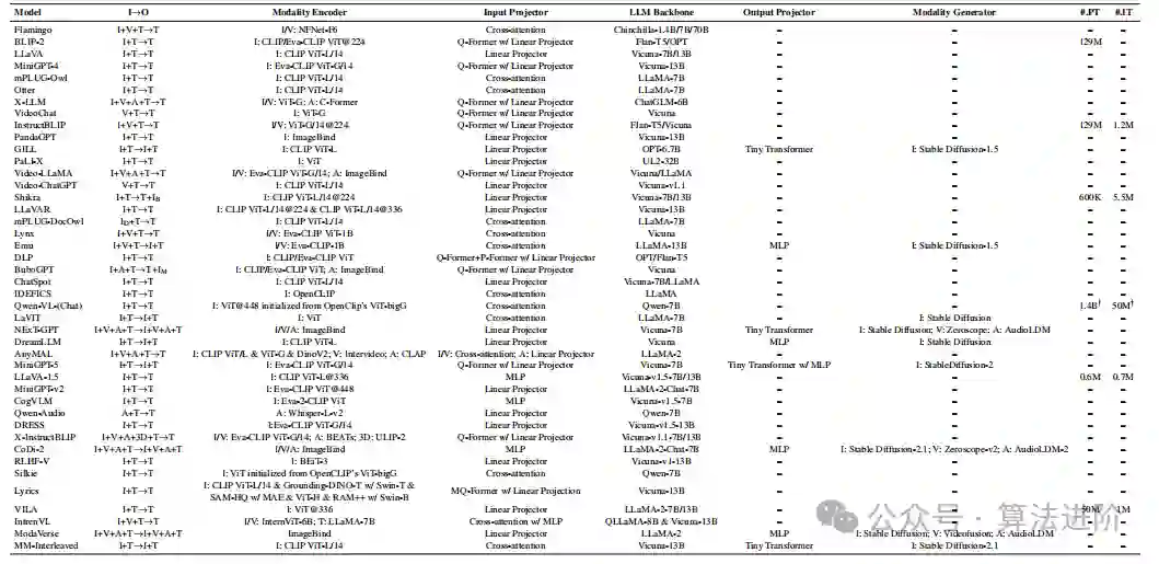 图3 MM-LLM的分类。I:图像,V:视频,A/S:音频/语音,T:文本。ID:文档理解,IB:输出框边界,IM:输出分割掩模,IR:输出检索图像。表1 43个主流MM-LLM的总结。I→O:输入到输出模态,I:图像,V:视频,A:音频,3D:点云,T:文本。在 Modality Encoder 中,“-L”表示 Large,“-G”表示 Giant,“/14”表示 patch 大小为 14,“@224”表示图像分辨率为 224 × 224。#.PT 和 #.IT 分别表示 MM PT 和 MM IT 期间数据集的规模。† 包括不可公开访问的内部数据。