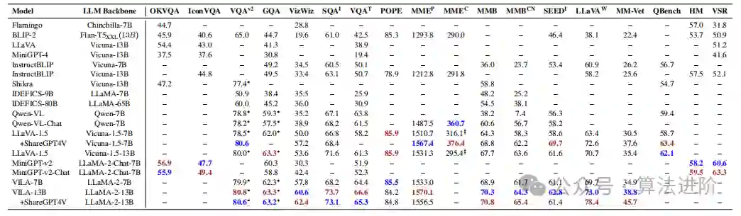 5 基准和性能为了比较不同视觉语言基准上的主要MMLLMs,我们整理了一个表格,其中包含来自各种论文的信息,如表2。为了解决高分辨率导致更长的令牌序列和额外训练成本的问题,一些论文提出了解决方案。其中,Monkey提出了一种解决方案,仅使用低分辨率视觉编码器提高输入图像的分辨率。此外,高质量的SFT数据可以显著提高特定任务的性能。VILA揭示了几项关键发现,包括在LLM后端上执行PEFT促进深度嵌入对齐的重要性,交错的图像-文本数据是有益的,而单独的图像文本对是不够理想的。在SFT期间重新混合仅包含文本指令数据与图像文本数据不仅可以解决纯文本任务性能下降的问题,还可以提高VL任务的准确性。表2 主流MM-LLMs在18个VL基准上的比较。红色表示最高结果,蓝色表示第二高结果。‡表示ShareGPT4V(Chen等人,2023f)重新实现的测试结果,这些结果在基准或原始论文中缺失。*表示在训练过程中观察到训练图像。 6 未来方向本节研讨了MM-LLMs在以下多个领域中所展现出的充满潜力的未来发展趋势:**更强大的模型。**增强MM-LLMs的四个关键领域:(1)扩展模式:将MM-LLMs扩展到其他模式,如网页、热图和图表,以增加模型的通用性和普遍适用性;(2)多样化的LLM:整合各种类型和大小的LLM,提供根据具体要求选择最合适LLM的灵活性;(3)提高MM IT数据集质量:改进和扩展MM IT数据集,提高MM-LLMs在理解和执行用户命令方面的有效性;(4)加强MM生成能力:探索整合基于检索的方法,增强模型的整体性能。**更具挑战性的基准。**现有的基准可能不足以全面评估MM-LLMs的能力,因为它们可能已在训练过程中熟悉这些任务。当前基准主要集中于VL子领域,因此为MM-LLMs开发一个更具挑战性的、包含多种模式和统一评估标准的更大规模基准至关重要。例如,GOAT-Bench和MathVista分别用于评估MM-LLMs在识别社会虐待微妙方面和视觉上下文中的数学推理能力。MMU和CMMMU是为专家AI设计的英语和中文多学科MM理解与推理基准。BenchLMM评估MM-LLMs的跨风格视觉能力,而Liu等人则深入研究了MM-LLMs的光学字符识别能力。**移动/轻量级部署。**为了在资源受限平台上部署MM-LLM并实现最佳性能,需要采用轻量级实现。近年来,已经进行了许多类似的研究,通过比较性能或最小损失实现了有效的计算和推理。然而,这一领域仍需要进一步探索以取得进一步的进展。MobileVLM是一种显著的方法,通过降低LLaMA的规模和引入轻量级的下采样投影器,实现了无缝的现成部署。**实体智能。**实体智能是一种旨在通过理解环境、识别对象、评估空间关系和制定任务计划来复制人类对周围环境感知和交互的人工智能技术。PaLM-E和EmbodiedGPT是该领域的典型工作,前者通过训练MM-LLM引入多身体代理,处理通用VL任务,后者提出经济高效的CoT方法,增强实体代理与现实世界的互动能力。尽管基于MM-LLM的实体智能在机器人集成方面取得进展,但需要进一步探索来增强机器人的自主性。**持续学习。**MMLLMs由于训练成本高,不适合频繁重新训练,但为了更新技能和跟上人类知识,更新是必要的。因此,持续学习(CL)是必要的,分为持续的PT和持续的IT。最近提出了连续MMIT基准,用于在原始MMIT阶段学习任务的同时,为MM-LLMs连续微调提供新MM任务的能力,同时保持对已学习任务的优异性能。这引入了两个主要挑战:灾难性遗忘,即模型在学习新任务时忘记以前的知识,以及负向正向转移,表明在尝试新任务时性能下降。**减轻幻觉。**幻觉是指在没有视觉线索的情况下生成文本描述的生成对象,可能出现在多种类别中,如描述中的误判和不准确。幻觉的根源包括训练数据中的偏见和注释错误,以及段落分隔符相关的语义漂移偏见。当前缓解幻觉的方法是利用自我反馈作为视觉线索,但挑战仍然存在,需要区分准确和幻觉输出,并在训练方法上取得进展以提高输出可靠性。MM-LLMs的最新进展链接:https://mm-llms.github.io