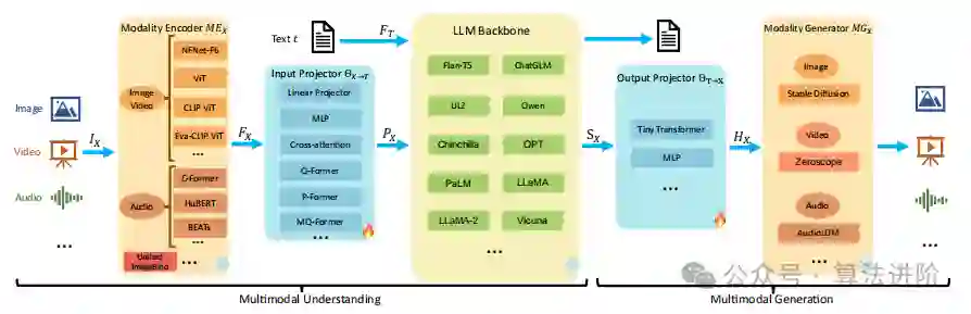 图1 MM-LLMs的时间轴2 模型体系结构本节概述了构成通用模型架构的五个组件,如图2所示,包括模式编码器、LLM主干、模式生成器和输入输出投影器。MM-LLM仅包括前三个组件,在训练过程中,模式编码器、LLM主干和模式生成器通常保持冻结状态,主要优化重点在于输入和输出投影器。MM-LLM中可训练参数的比例与总参数数量相比明显较小,通常约为2%。总体参数数量取决于MM-LLM中使用的核心LLM的规模。因此,MM-LLM可以高效地训练以支持各种MM任务。 图2 MM-LLMs的一般模型架构以及每个组件的实现选择。2.1 模态编码器模态编码器(ME)将来自不同模态的输入IX编码为相应的特征FX。