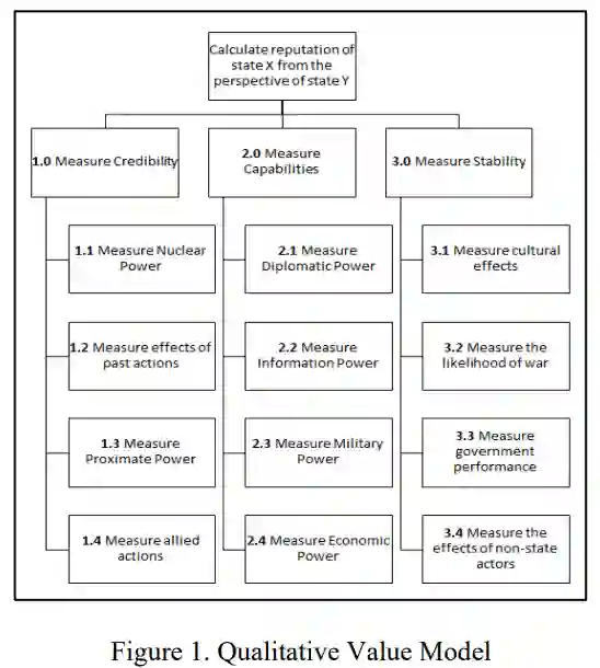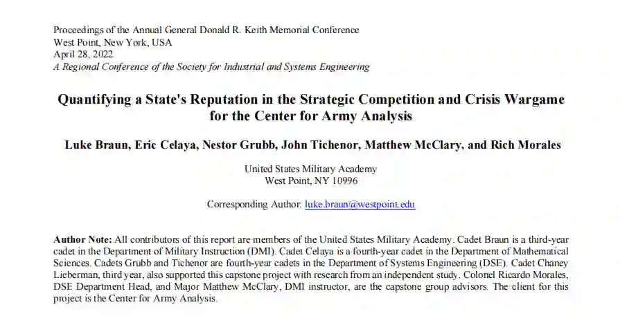 美国军队分析中心(CAA)开发了战略竞争与危机兵棋推演,以捕捉现代军事竞争在当今世界的运作方式。CAA责成我们的跨学科团队开发一个更强大、更全面的声誉模型,利用在系统工程、国防和战略研究以及运筹学中各自的专业,从另一个国家的角度来量化一个国家的声誉。该团队利用系统决策过程中的工具来量化理论上的、无形的声誉概念。研究从基于专家利益相关者分析和文献审查的定性价值模型开始。然后,研究小组确定了价值衡量标准,以建立一个摇摆权重矩阵,从另一个国家的角度为每个国家产生一个声誉分数。这个分数,以及一个增强的游戏用户界面,现在可以被整合到现有的SC2兵棋推演中,以提供一个更完整的、叙述性的体验,在整个游戏中记录玩家的决定。