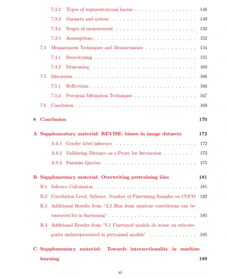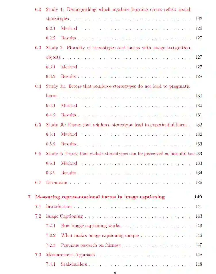 随着机器学习(ML)从研究阶段逐步应用于现实世界,它正在对社会产生深刻的影响。这项技术带来了巨大的潜在益处,但也引发了关于公平性的重要担忧,包括不同群体表现差异、不公平的风险预测、刻板的搜索结果等。到目前为止,我们倾向于从平等的角度来思考公平问题,因为平等在数学上更易于表述(例如,不同群体间的准确率相等)。然而,现在随着人们对负责任的机器学习问题的关注日益增加,以及解决这些问题的动力越来越强,我们需要更接近于“公平”的形式化定义。作为公平性的“公平”更关注社会背景和历史不公,通过认识到不同人处于不平等的环境并具有不同的需求来实现更全面的公正性。然而,这种公平的概念更难以量化和实际应用于机器学习模型中。然而,为了确保技术的进步不会像历史上那样忽视边缘化群体,这种量化是至关重要的。 目前已有大量文献和研究领域在算法偏见的社会科学和人文学科方面做了深入的研究。然而,像“正义”和“公平”这样的概念如何转化为机器学习方法却并不总是显而易见,这也部分解释了为什么现有的技术方法往往偏向于数学上便于操作的“平等”概念。尽管确实不可能完全量化社会背景中的概念,也不能完全依靠技术来解决这些问题,但认为这些概念太定性或主观而无法量化的观点却导致了对它们的忽视。接下来,我将描述一项研究计划,旨在将这些重要的社会结构概念具体化到机器学习中。在这一过程中,势必要进行权衡,每种方法都有其局限性。然而,只有完全面对和参与真实世界的复杂现实,我们才能构建更接近公平的机器学习系统。 这在机器学习的各个方面都很重要——不仅仅是构建机器学习系统,还包括思考系统嵌入的结构、允许的使用场景和问题定义。然而,鉴于本论文的范围,我们将主要关注机器学习系统本身的各个方面,同时承认很多时候最重要的问题在于一个特定的系统是否应该被构建。 在本论文中,我们将深入探讨如何将负责任的机器学习具体化,按照机器学习管道的顺序,从数据集入手,逐步讨论模型训练,最后分析模型评估。 首先,在第二章中,我们将讨论机器学习数据集中的偏见,尤其是图像数据集。数据集是所有机器学习模型的基础,因此不可避免地包含一些对世界的有偏见的呈现方式。尽管最终有害的偏见类型会因下游应用的不同而异,但对于数据集创建者和用户来说,了解数据集中的偏见特征是非常重要的。鉴于这些数据集的规模及其潜在的偏见,我们提出了一种半自动化的偏见发现工具。研究表明,性别刻板印象对不同性别群体造成不同程度的危害,这引发我们对社会身份在认识论权威方面的相关性的思考。最后,在第七章中,我们将整合这些主题,提出一套全面的衡量图像描述系统中表现性伤害的方法。许多衡量标准彼此冲突,也就是说不可能同时改进。因此,通过提出多种衡量方法而非集中于单一标准,我们希望能直接揭示这些冲突,并展示模型选择和训练过程中需要在期望的公平性结果上作出抉择。 总之,我们将按照机器学习管道的顺序,从数据集开始,最终到模型评估,展示如何在负责任的机器学习中更深刻地与社会背景进行互动,以构建更公平的机器学习系统。 接下来,我们将讨论ML模型的训练。在第三章中,我们将讨论数据集在预训练和微调中的作用。目前,模型和数据集都太大,无法每次都从头开始训练。因此,利用迁移学习的优势,首先在更大的数据集上进行预训练,然后针对更小、更具应用性的特定数据集进行微调。虽然对用于预训练的大规模数据集的偏见存在一些担忧,但我们的研究表明,这些偏见可以通过对微调数据集的相对较小的调整得以克服,且性能几乎不受影响。在考虑模型训练的另一个相关问题时,我们将在第四章讨论公平性方法往往集中于同时处理两个群体,如男性和女性,白人和黑人。然而,现实世界远比这复杂得多,需要理解并处理交叉性问题。我们不仅提供了关于如何将交叉性纳入考虑的指导,还讨论了具体的实施方法。 继续推进机器学习管道,最后三章将讨论公平性评估这一常被忽视的步骤。在这些章节中,我们首先在第五章讨论一种实现社会偏见放大的方法。在此过程中,我们将展示我们在技术工作中通常所做的假设如何在社会环境中并不总是适用,因为这些假设破灭所带来的道德影响。社会偏见放大可以被看作是由刻板印象驱动的,因此在第六章中,我们将探讨机器学习误分类可能强化或打破刻板印象的实际危害。为此,我们将精确地定义何为“伤害”,并提出务实性和体验性伤害的不同类别。