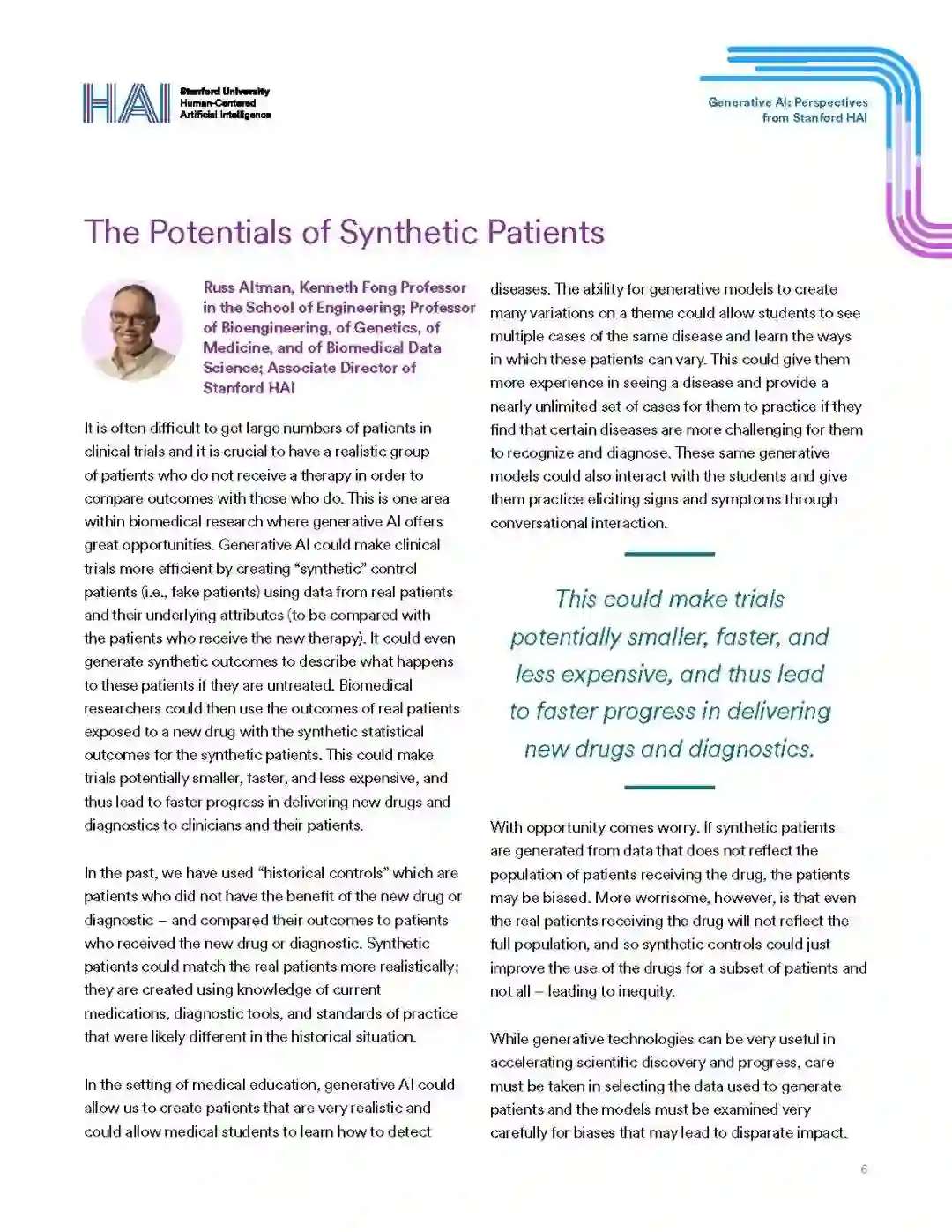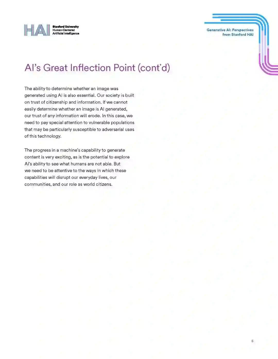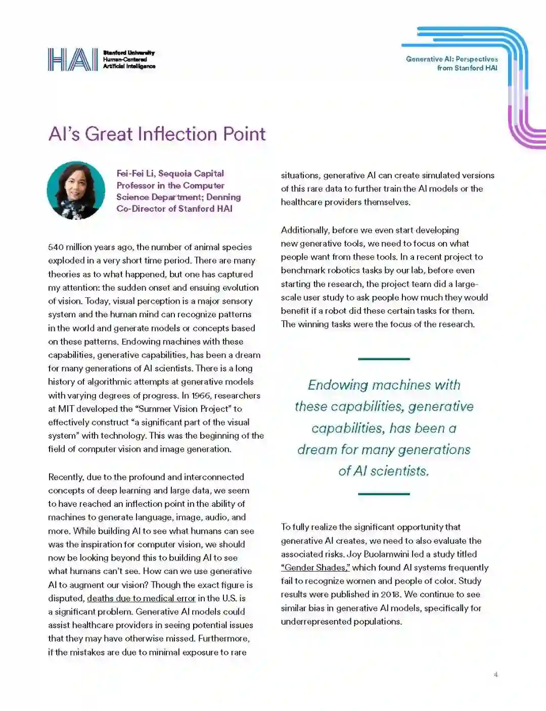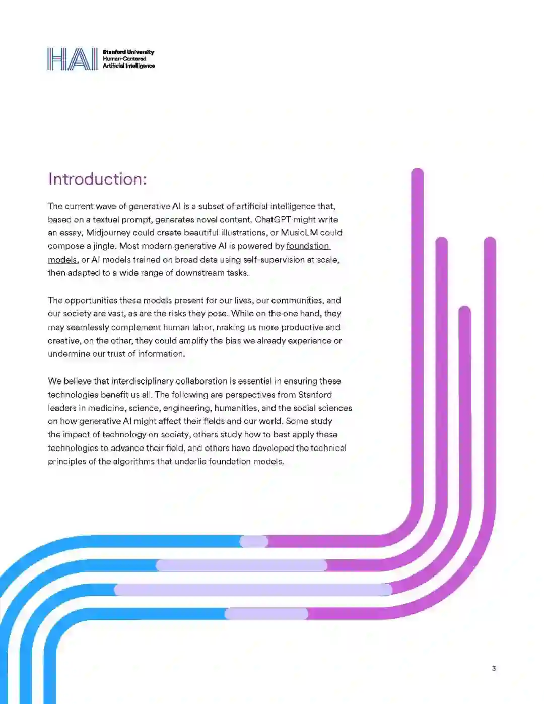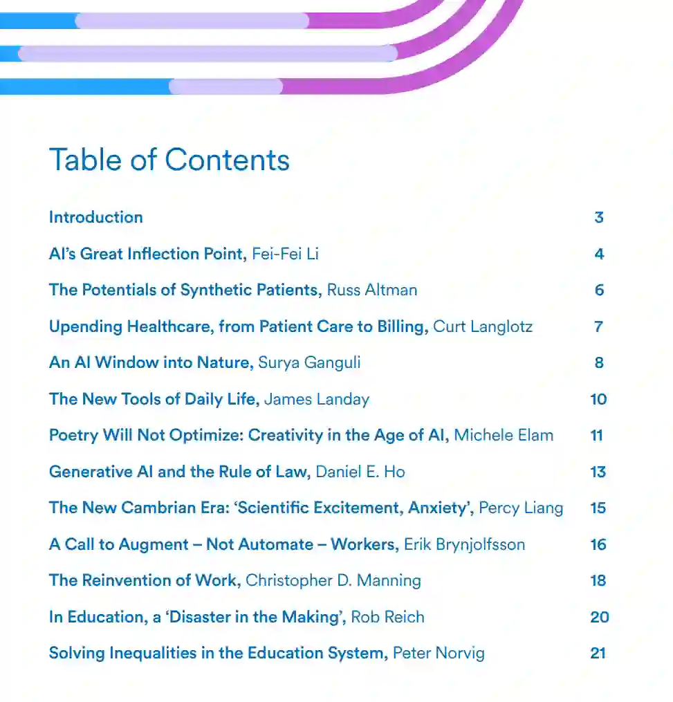 当前的生成式人工智能浪潮是人工智能的一个子集,它基于文本提示生成新颖的内容。ChatGPT可以写一篇文章,Midjourney可以创作漂亮的插图,或者MusicLM可以创作一首广告歌。大多数现代生成式AI都是由基础模型驱动的,或使用大规模自监督在广泛数据上训练的AI模型,然后适应广泛的下游任务。这些模式为我们的生活、我们的社区和我们的社会带来了巨大的机遇,也带来了巨大的风险。一方面,它们可以无缝地补充人类的劳动,使我们更有生产力和创造力,另一方面,它们可能会放大我们已经经历的偏见或破坏我们对信息的信任。我们相信,跨学科合作对于确保这些技术惠及我们所有人至关重要。以下是斯坦福大学医学、科学、工程、人文和社会科学领域的领导人对生成式人工智能如何影响他们的领域和我们的世界的观点。一些人研究技术对社会的影响,另一些人研究如何最好地应用这些技术来推进他们的领域,还有一些人开发了基础模型下的算法的技术原理。