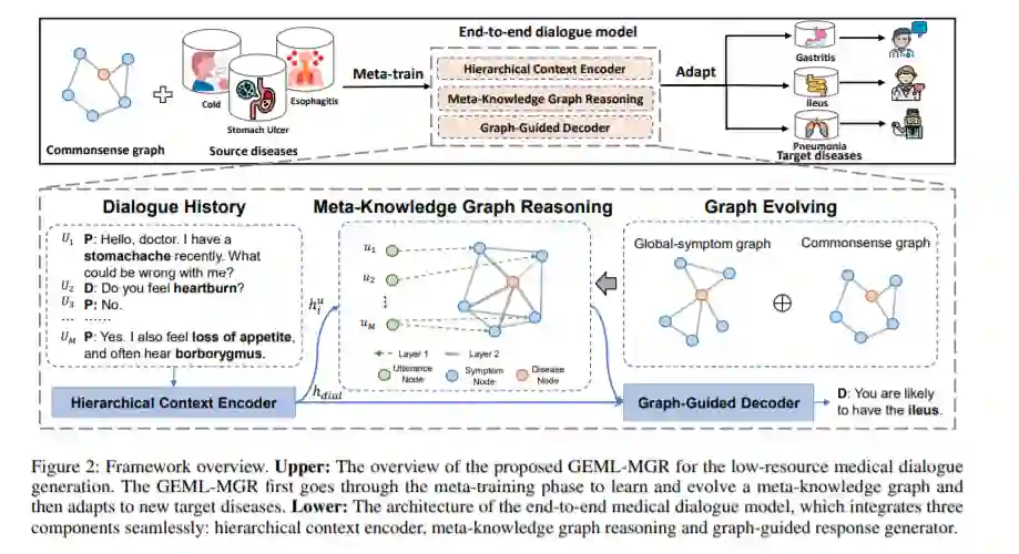 拥有良好医学知识的人类医生,只需与病人进行几次有关症状的对话,就能诊断出疾病。相比之下,现有的以知识为基础的对话系统往往需要大量对话实例来学习,因为它们无法捕捉不同疾病之间的相关性,忽视了它们之间共享的诊断经验。为解决这一问题,我们提出了一种更自然、更实用的范式,即低资源的医疗对话生成,它可以将源疾病的诊断经验转移到有少量数据可供适应的目标疾病。它利用常识知识图谱来表征先前的疾病症状关系。此外,我们还开发了一个图演化元学习(GEML)框架,该框架通过学习进化常识图谱来推理一种新疾病的疾病症状相关性,有效地缓解了大量对话的需求。更重要的是,通过动态演变的疾病症状图,GEML还很好地解决了现实世界的挑战,即每种疾病的疾病症状相关性可能随着更多诊断病例而变化或演变。在CMDD数据集和我们新收集的Chunyu数据集上的大量实验结果证明了我们的方法优于最先进的方法。此外,GEML还可以在线生成丰富的对话敏感的知识图谱,对其他基于知识图谱的任务有借鉴意义。