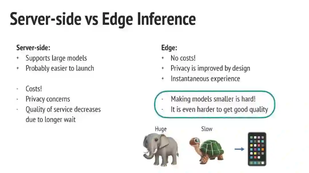 然而,这些突破以这些模型的高计算需求为代价。例如,根据Token长度,具有二次复杂性的变换模型,图像到图像转换需要大量的FLOPs,而神经渲染方法需要复杂的渲染管道。这转化为在服务器端运行这些模型的需求,提高服务成本,并且由于传输数据和接收结果所产生的延迟,用户体验不是最佳。 将这些方法带到边缘设备上是出了名的困难。现有的工作目标是压缩大型模型,但这不一定会导致设备上的加速,因为它不仅需要神经网络压缩的背景知识,还需要特定领域的背景知识。例如,要在设备上运行神经渲染,就需要在图形方面有经验;要运行生成模型,就需要知道如何在不牺牲输出质量的情况下减小大小。加速服务器端推理的神经网络不一定会提高边缘推理的效率,因为在边缘设备上部署它们需要大幅度减小模型的大小,有时达到几个数量级。