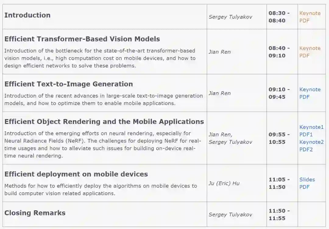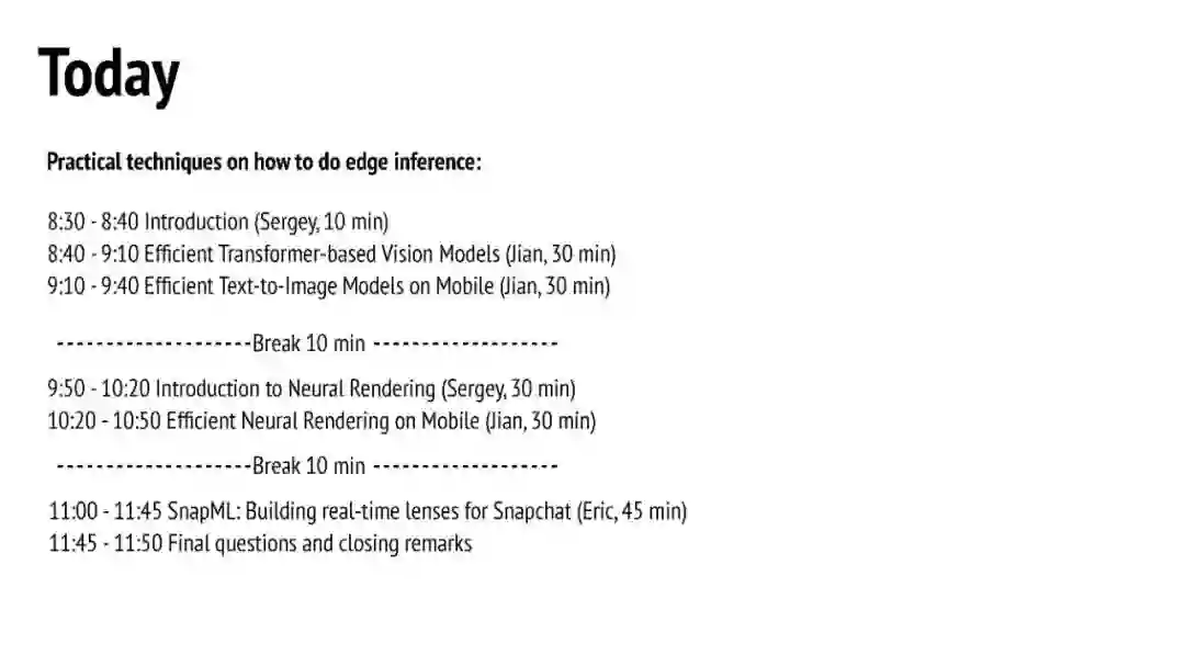 这个教程将介绍重新设计算法的有效方法,以实现高效的内容理解、图像生成和神经渲染。最重要的是,我们将展示如何将算法有效地部署在移动设备上,最终实现用户与移动设备之间的实时互动。