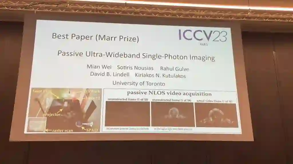 获奖论文:Passive Ultra-Wideband Single-Photon Imaging * 作者机构:多伦多大学 * 论文地址:https://openaccess.thecvf.com/content/ICCV2023/papers/Wei_Passive_Ultra-Wideband_Single-Photon_Imaging_ICCV_2023_paper.pdf