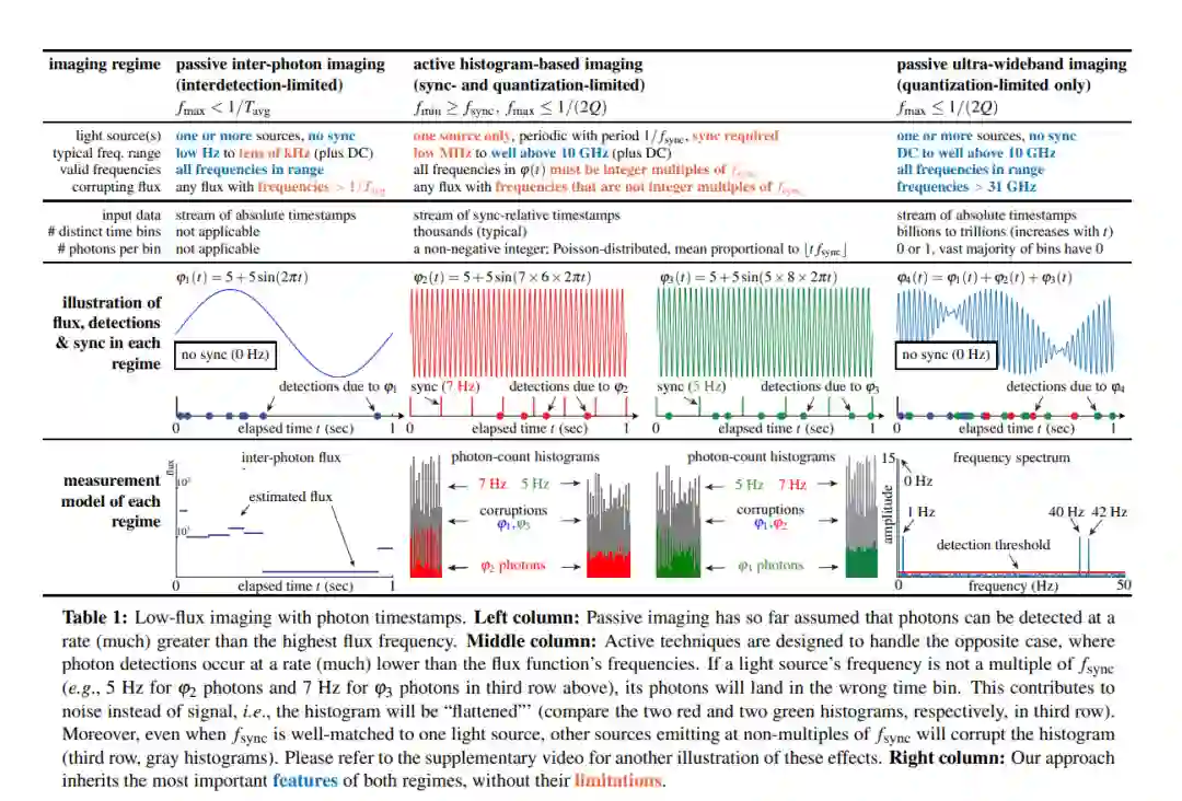 我们考虑如何在极端的时间范围内同时对动态场景进行成像—从秒到皮秒—并且这样做是被动的,光线不多,且不需要来自发光源的任何时间信号。因为现有的单光子相机的光束估计技术在这个范围内失效,我们开发了一种光束探测理论,该理论从随机微积分中得到启示,以实现从单调递增的光子检测时间戳中重建像素的时间变化光束。我们使用这个理论来 (1) 显示在低光束条件下,被动自由运行的SPAD相机具有可达到的频率带宽,该带宽跨越整个直流到31 GHz范围,(2) 推导出一个新颖的傅里叶域光束重建算法,该算法扫描此范围以寻找时间戳数据中具有统计显著支持的频率,以及 (3) 确保即使对于非常低的光子计数或不可忽略的死亡时间,算法的噪声模型仍然有效。通过实验证明了这种异步成像模式的潜力,展示了一些前所未见的能力:(1) 同时由在极其不同速度下运行的发光源(如灯泡、投影机、多个脉冲激光器)照亮的场景进行成像,而不需要同步,(2) 被动非视线视频采集,以及 (3) 录制超宽带视频,稍后可以以30 Hz的速度回放,以显示日常动作—但也可以放慢十亿倍速度以显示光的传播本身。