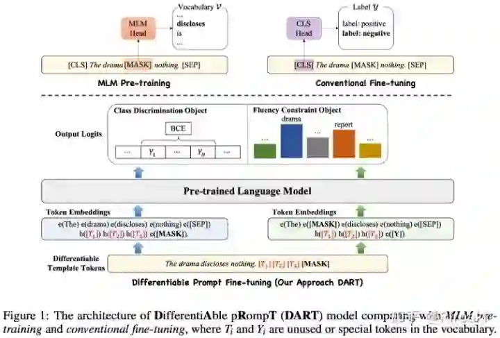 二、动机 提示学习通过引入任务相关的模版和标签映射,将一般的分类任务转换为和语言模型预训练过程中遮盖文本建模(Masked-Language Modeling)目标一致的形式,因而如何选取合适模版和标签映射就成为其核心。从PET的手工构建模版,到AutoPrompt和LM-BFF等工作基于梯度或者生成模型选取离散模版词,再到P-tuning引入外部架构并从任务中学习连续化模版词,可以看出提示学习的工作经历了从离散到连续、从手工到自动的演进过程,类似于人工智能领域从特征工程到深度学习的范式变化。有鉴于离散化模版词的非最优性,本文提出的DART(DifferentiAble pRompT)方法采用了一种简单的构造方式,可以在任务中同时学习连续化的模版和标签映射。