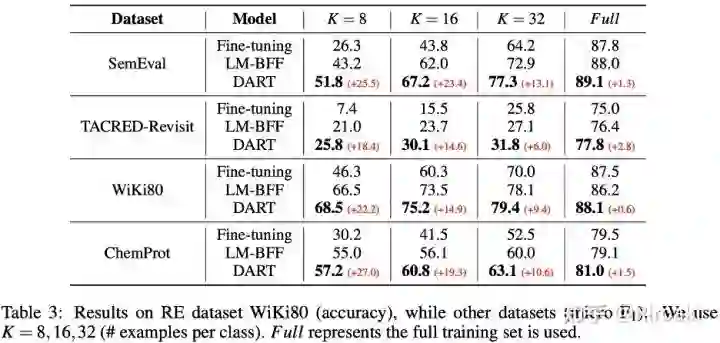 四、实验分析 本文列出了DART模型在15个NLP数据集上的表现,包括情感分析、自然语言推理、释义、句子相似度、关系抽取和事件抽取的多种任务,其中涵盖主流的句子分类数据集如SST-2、MR、CR、Subj、TREC、MNLI、QNLI、MRPC和QQP等,以及多种关系/事件抽取数据集如SemEval 2010、TACRED-Revisit、Wiki80、Chemprot、ACE2005等,并与现有工作进行了对比。以下表格列出了主要的实验结果,具体的实验结果和分析可以参见论文。