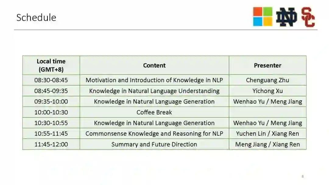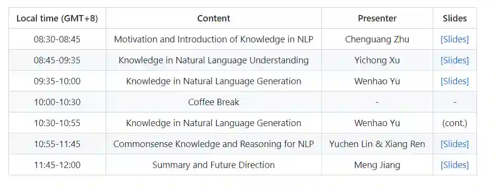 特别是在大规模预训练模型出现后,NLP中的知识一直呈上升趋势。注意力知识的NLP模型可以i)访问无限数量的外部信息;Ii)将参数空间中的知识存储任务委托给知识源;Iii)获取最新信息;Iv)通过选择知识,使预测结果更具可解释性。在本教程中,我们将介绍将知识集成到NLP中的关键步骤,包括来自文本的知识基础,知识表示和融合。本文还将介绍最近在将知识融合到语言理解、语言生成和常识推理方面的最先进应用。