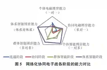 根据经验,给出各阶段的主要能力如图5所示,从图中大致可以看出,随着网络化协同电子战不断向前推进,个体电子战能力并未提升,甚至不断下降,但体系对抗能力不断提升,进而带来了实战作战效能的质的飞跃。从点对点式的电磁博弈,逐步演变为体系破击式电磁博弈。最终带来的结果就是电磁频谱领域的博弈复杂度、不确定性、动态性、涌现性、突然性等方面大幅提升。