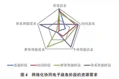 根据经验,给出各阶段的资源需求如图4所示,从图中大致可以看出,随着网络化协同电子战逐步进入人工智能时代,其最大的资源需求变化体现在个体智能需求的提升、带宽需求的下降、协同需求的提升。