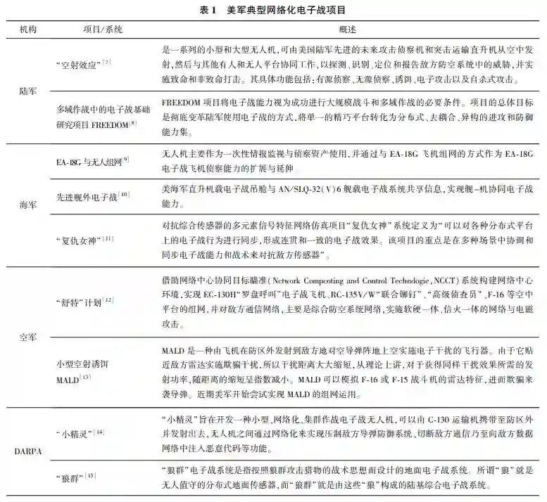 美国国防部、各军种目前仍非常重视网络化电子战能力的发展,并开发了一系列项目,典型项目如表1所示。 3 网络化协同电子战代际划分初探