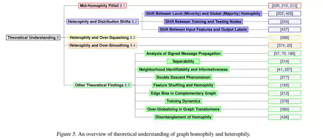 通常认为同质性对图学习有益,而异质性结构对模型性能有负面影响。然而,最近的实证研究(见第4.1节)和理论结果表明,同质性和异质性的影响远比“同质性胜利,异质性失败”要复杂得多。研究人员对同质性/异质性的理解存在不同观点,这些争议在近年来图社区中得到了广泛讨论。在本节中,我们将总结近期在不同方面的理论研究,包括中等同质性陷阱(第8.1节)、分布偏移(第8.2节)、异质性与过度压缩(第8.3节)、异质性与过度平滑(第8.4节)以及其他有趣的理论发现(第8.5节),如可分性、双下降现象、训练动态、过度全球化和同质性解缠等。在图5中,我们展示了本节的概述。