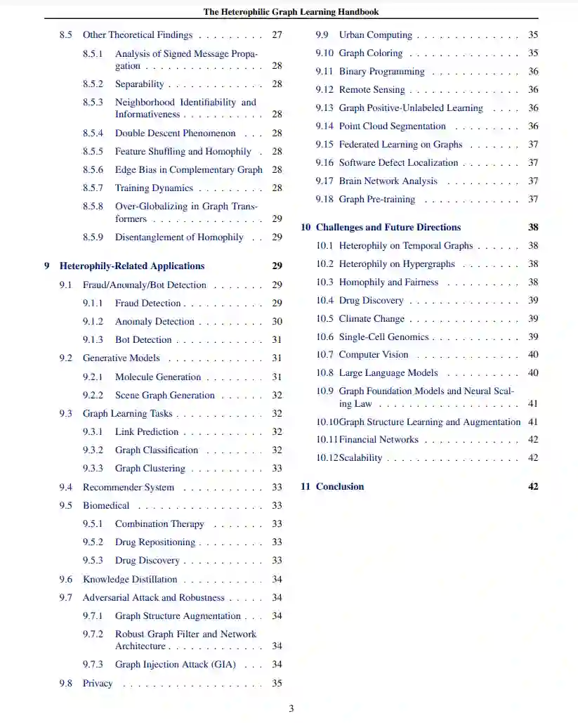 同质图上最新更新的异质性模型(第五部分) * 首次对异质图上异质性问题的模型进行回顾(第六部分) * 对异质图上无监督学习方法的广泛总结(第七部分) * 首次深入回顾同质性和异质性的理论研究(第八部分) * 对异质性相关应用的全面概述,如欺诈/异常检测、隐私保护、联邦学习、知识蒸馏和点云分割等(第九部分) * 对挑战和未来方向的最广泛和深入的概述,如大型语言模型(LLM)、图基础模型和缩放法则等(第十部分)