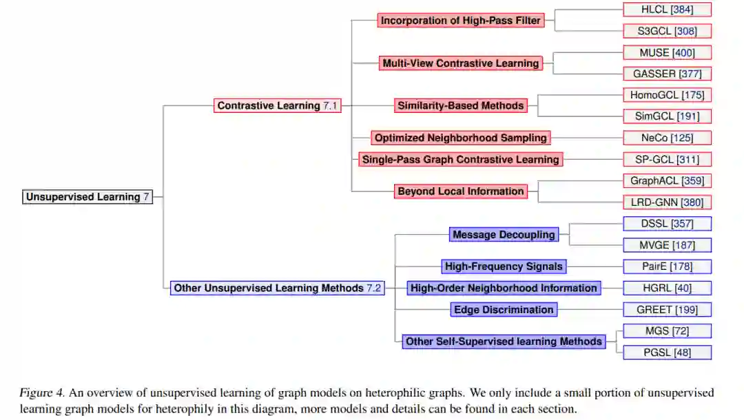 图无监督学习方法能够在没有标记节点的情况下学习节点嵌入和发现潜在结构。异质性的概念可以在图无监督学习中得到利用。在本节中,我们将探讨异质图上的对比学习(第7.1节),并总结其他无监督学习方法(第7.2节)。在图4中,我们展示了异质图上的无监督学习模型概述。
