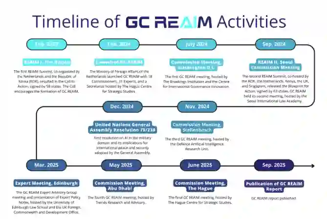 GC REAIM 认识到,关于人类能动性的规范性问题无法抽象地回答。规范和原则必须转化为可操作的指南和标准。针对这些考量,上述五项核心建议构成了一套针对社会技术人工智能系统生命周期各层级负责任实践的具体建议的基础,包括组织设计考量,以及为国家、军队和业界提供的具体指导。这些建议借鉴并符合显著的外交进展,并利用了联合国框架内正在形成的机构,包括国际人工智能科学小组和全球人工智能治理对话。它们为利益相关方在国家、区域和国际层面实施上述建议提供了具体步骤。通过本报告,GC REAIM 提出了全球合作的模式,以培养对负责任使用人工智能系统的合理信任,为军事领域人工智能治理的制度化铺平道路。