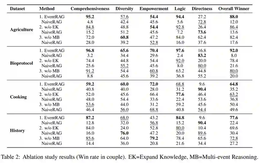 消融实验进一步揭示了事件知识图谱和多事件推理在EventRAG中的核心作用。移除知识扩展功能会导致生成内容的综合性和多样性显著下降,而禁用多事件推理则削弱了逻辑性和整体表现。