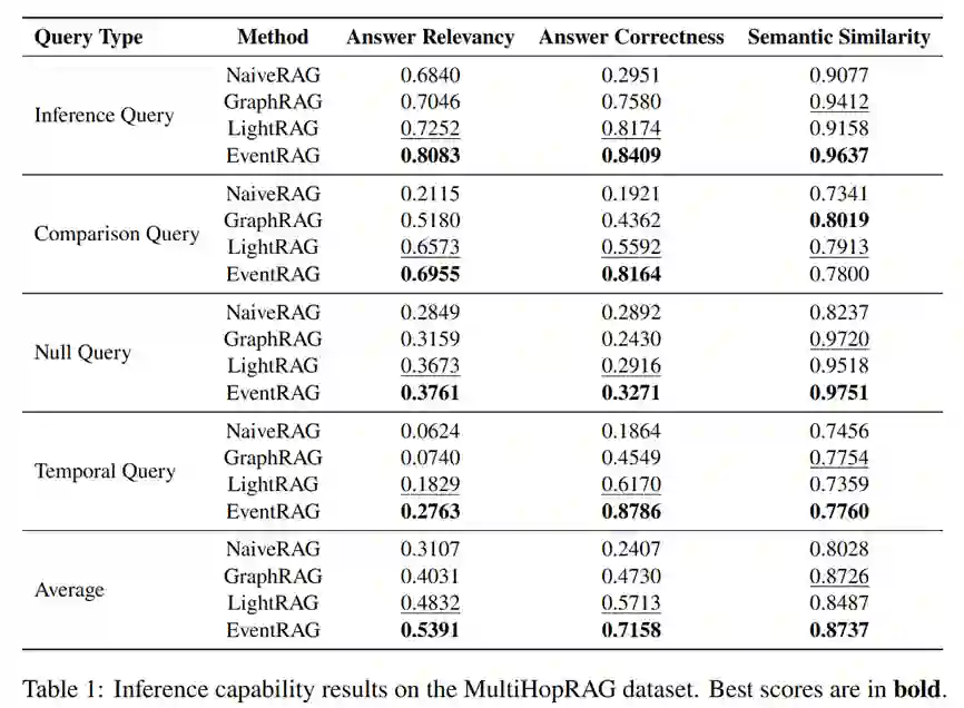 EventRAG在多个基准测试中的表现令人瞩目。在UltraDomain数据集(涵盖农业、烹饪、历史和生物实验领域)上,EventRAG在综合性、逻辑性和整体表现等关键指标上均显著优于基线模型,如NaiveRAG、GraphRAG和LightRAG。尤其在逻辑性方面,EventRAG通过事件知识图谱有效维护了事件关系的一致性,生成内容在叙事连贯性和事件描述的丰富性上表现出色。