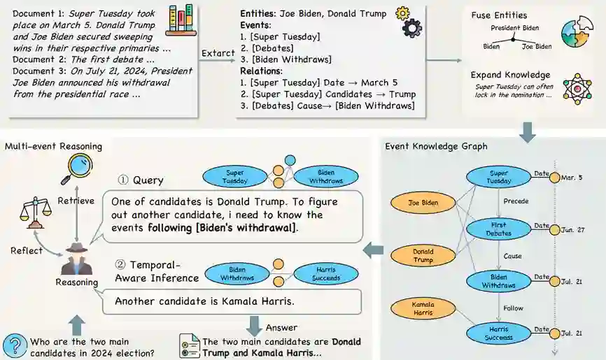 EventRAG的核心在于通过结构化的事件表示增强大语言模型的生成能力。其方法首先聚焦于从多文档输入中提取关键事件、实体及其关系,并将这些信息整合成一个事件知识图谱。在这一过程中,系统通过向量相似性匹配识别并合并跨文档中语义等价的实体或事件,以消除冗余并确保图谱的语义一致性。同时,针对图谱中连接不足的节点,EventRAG利用文档上下文或大语言模型的先验知识进行补充,进一步增强图谱的完整性和连通性,为后续推理提供了坚实基础。