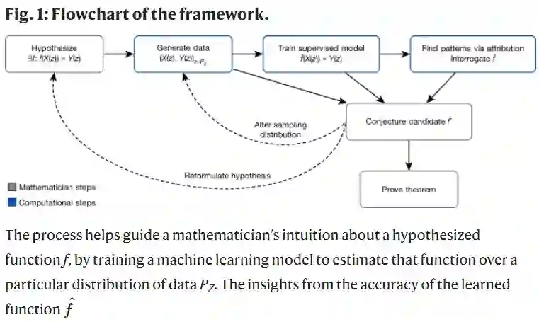 数学家的直觉在数学发现中扮演着极其重要的角色,只有结合严格的形式主义和良好的直觉才能解决复杂的数学问题。下图的框架描述了一种通用方法,数学家可以通过该方法使用机器学习工具来启发他们对复杂数学对象的直觉。这是一种自然且富有成效的方式,将统计学和机器学习很好地融入了数学研究。