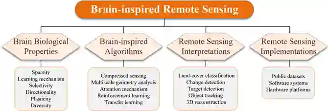 **内容简介:**脑启发算法已经成为下一代人工智能的新趋势。通过对脑科学的研究,可以有效提高智能遥感算法。本文对脑认知学习的特性和遥感解译的最新进展进行了总结和分析。首先本综述介绍了大脑的结构组成和特性; 然后,研究了5种代表性的类脑算法,包括多尺度几何分析、压缩感知、注意力机制、强化学习和迁移学习; 其次,对遥感数据类型、典型遥感解译应用发展和遥感算法实现,包括数据集、软件和硬件进行了介绍; 最后,本综述讨论了脑启发遥感解译的十大开放问题和未来发展方向。本文旨在全面综述脑机制和遥感研究进展,并为脑启发遥感解译的未来研究提供参考。